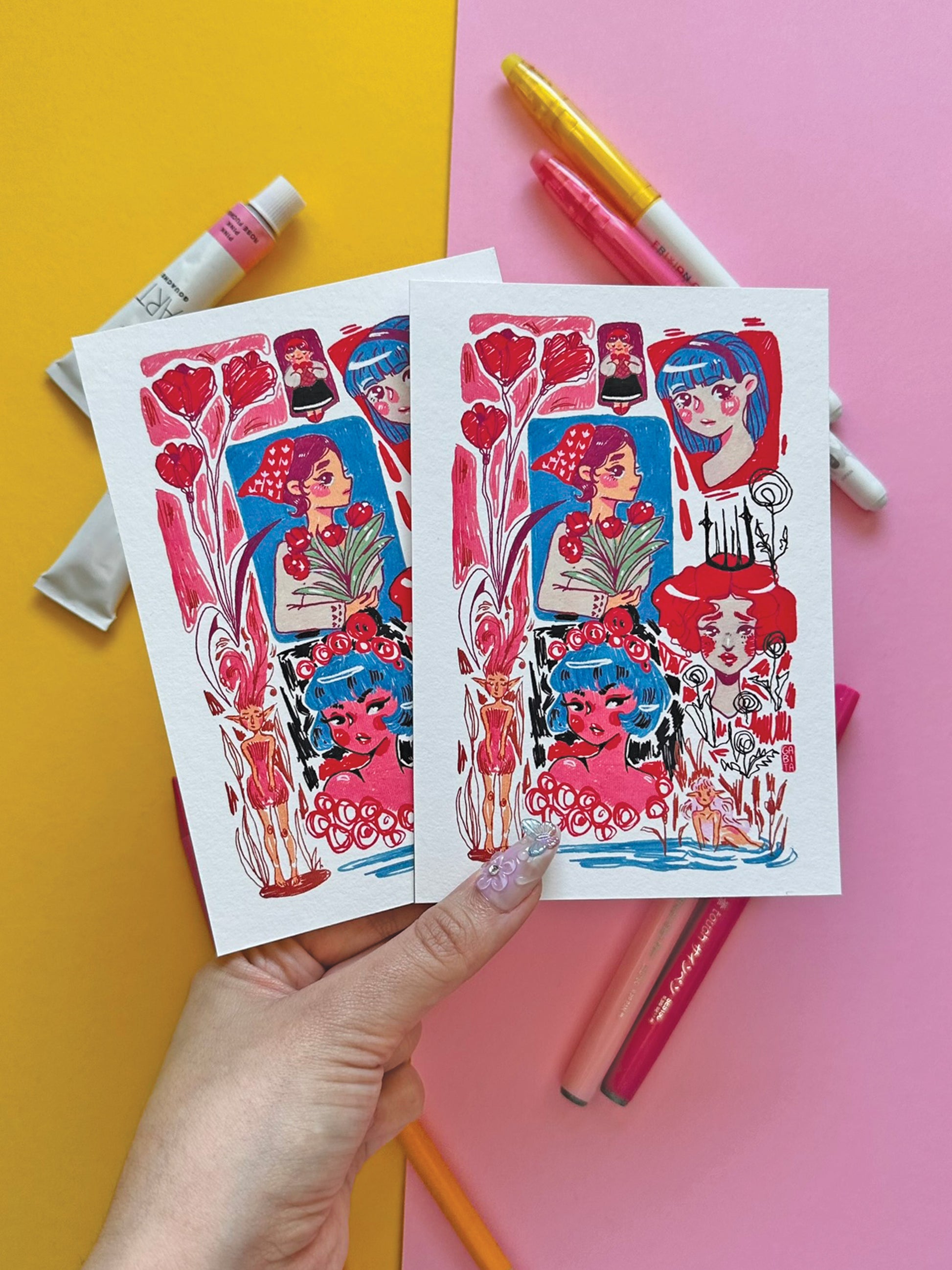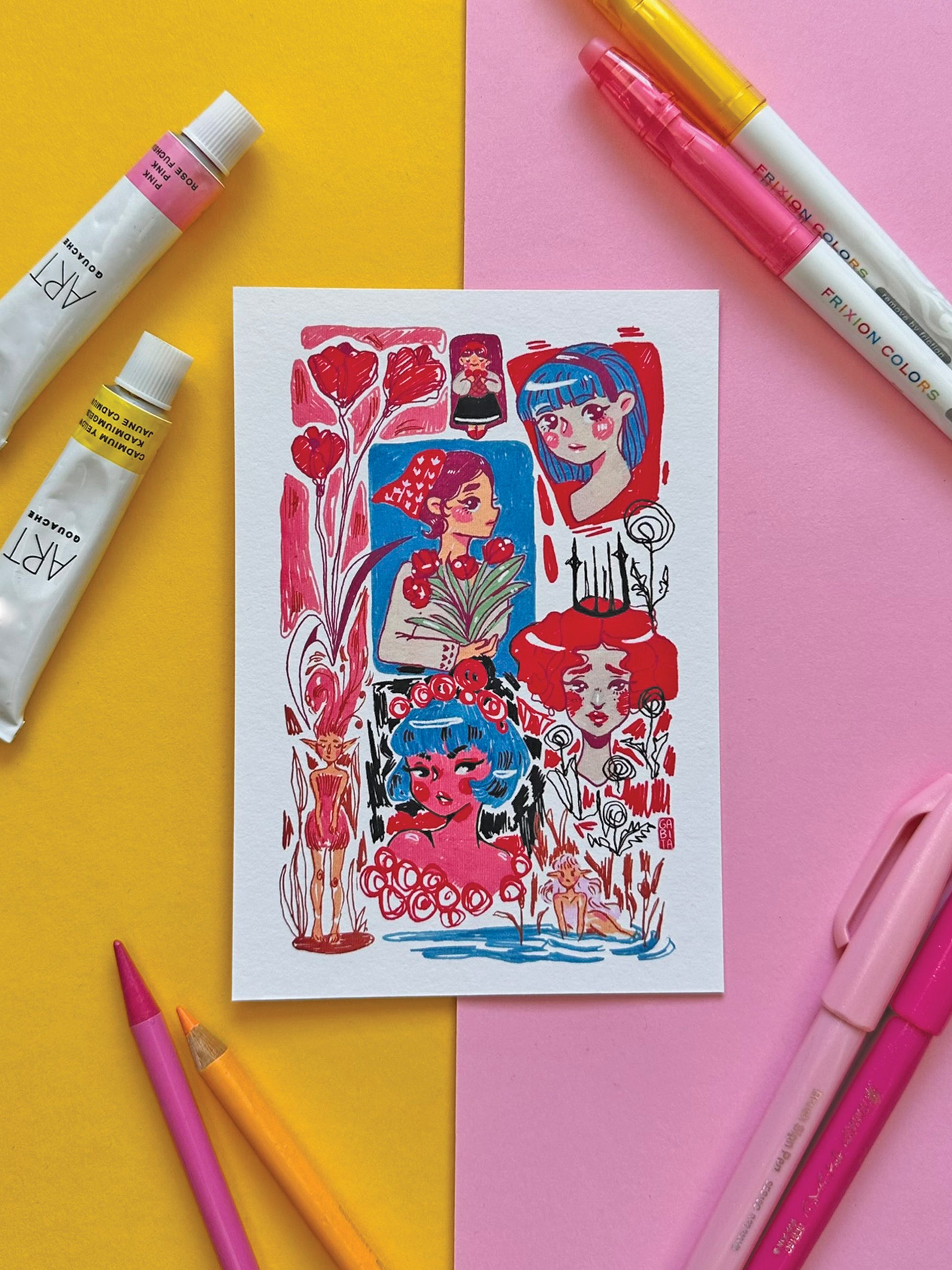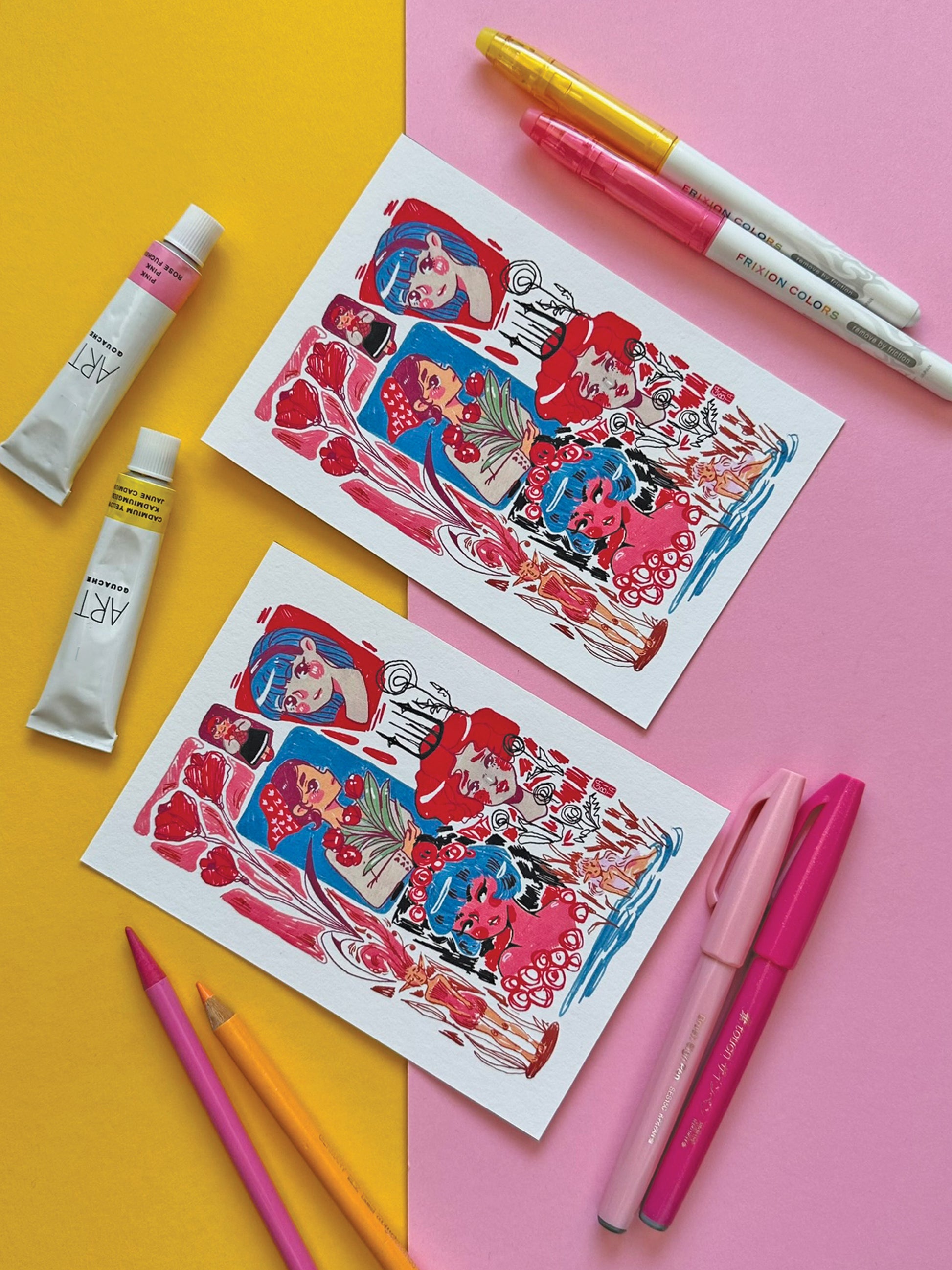 The motif of this art print was traditionally drawn by me using markers and coloured pencils. After drawing the illustration, I scanned it at 300 dpi and edited it to match the original artwork.