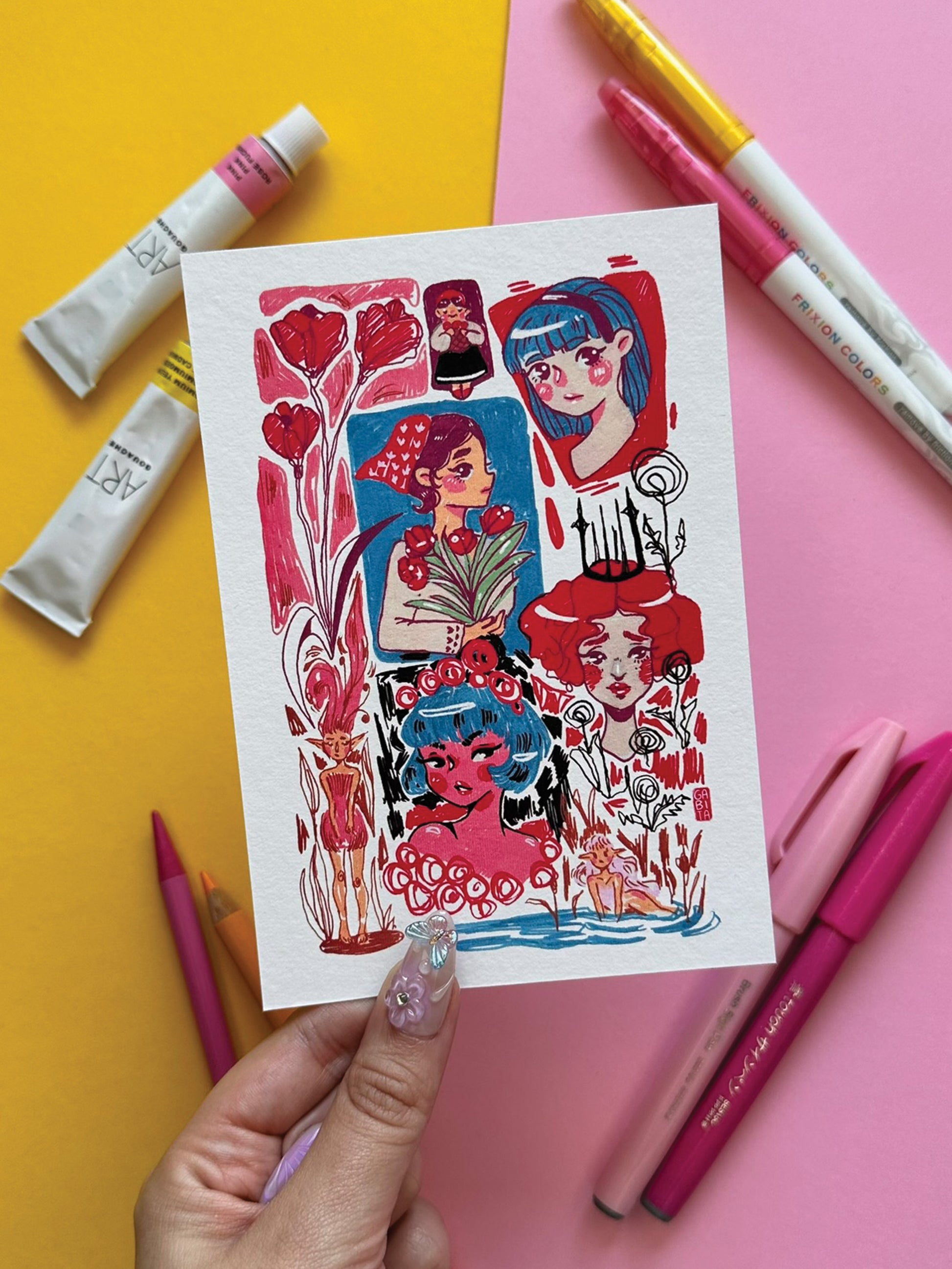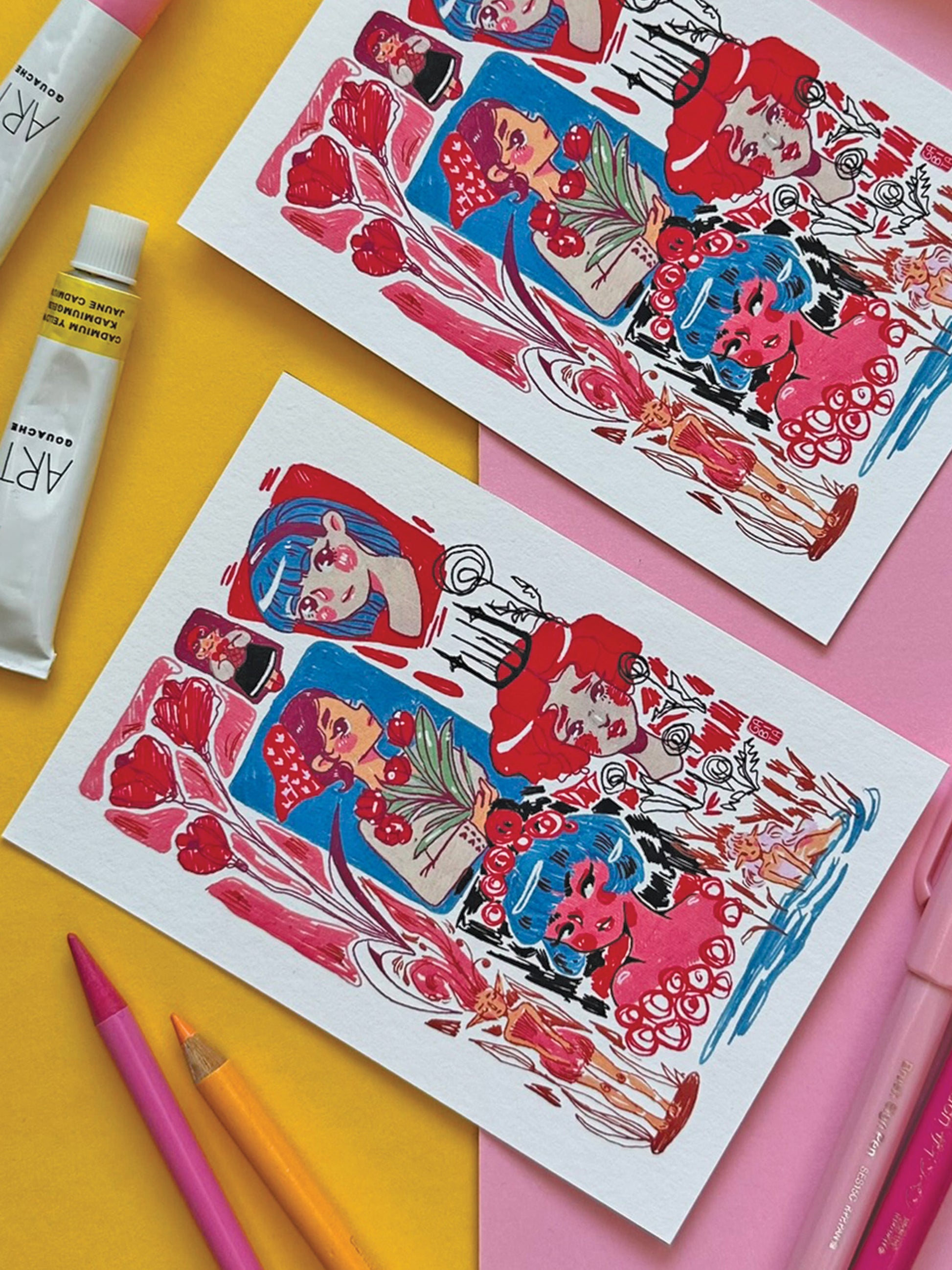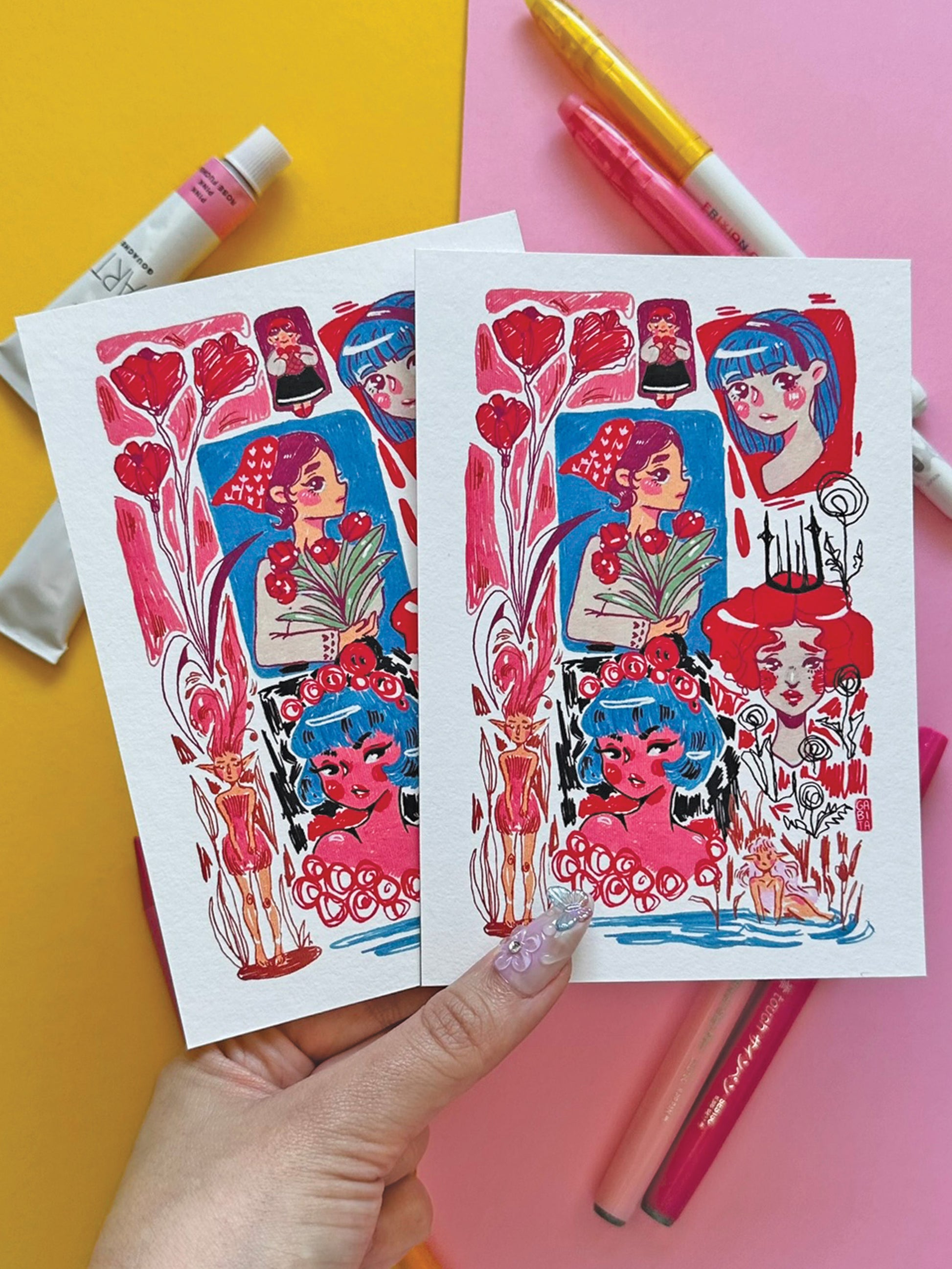 The motif of this art print was traditionally drawn by me using markers and coloured pencils. After drawing the illustration, I scanned it at 300 dpi and edited it to match the original artwork.