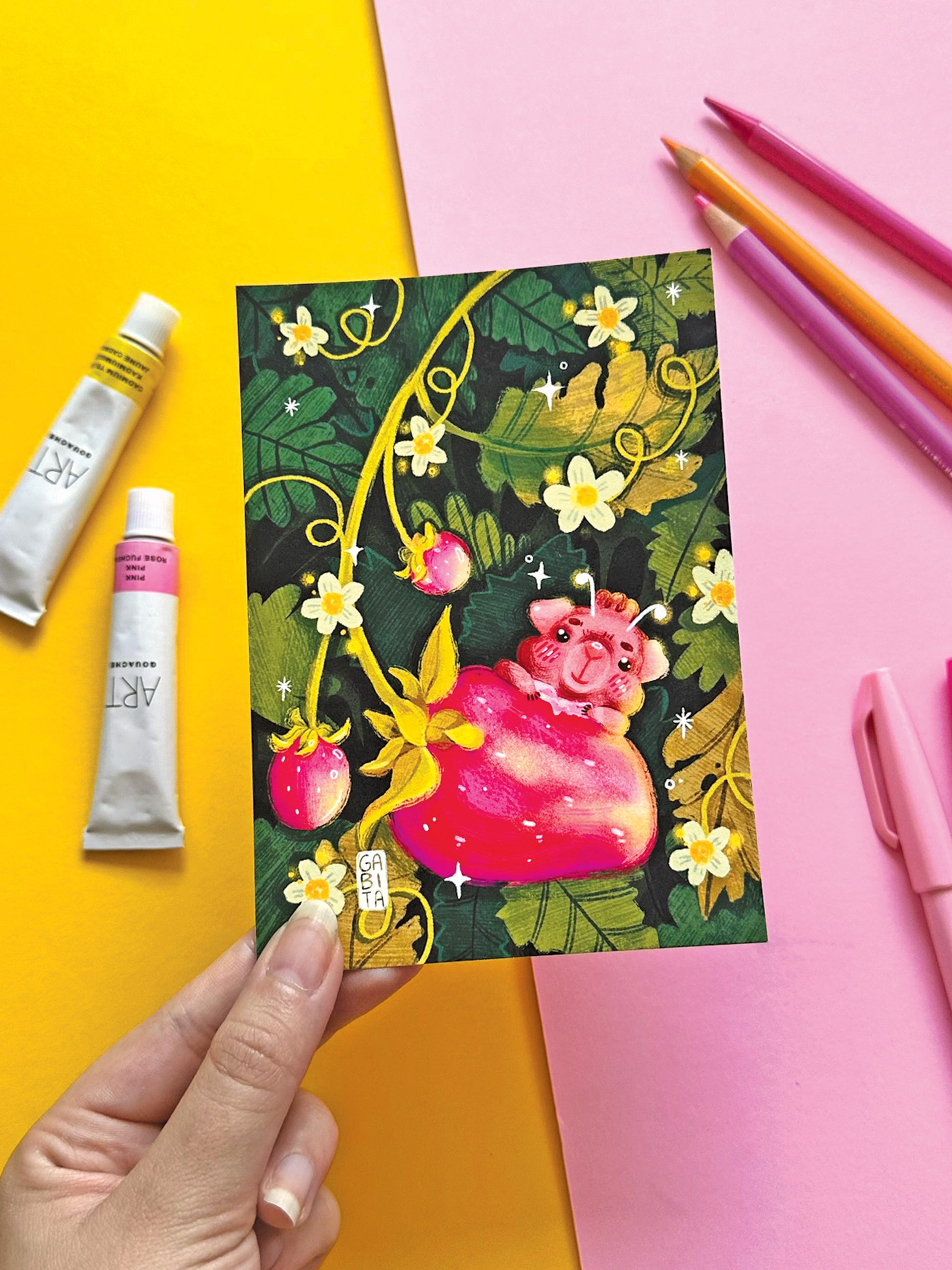 Whimsical Fairy Guinea Pig Strawberry Art Print, Adorable Hand-Drawn Illustration